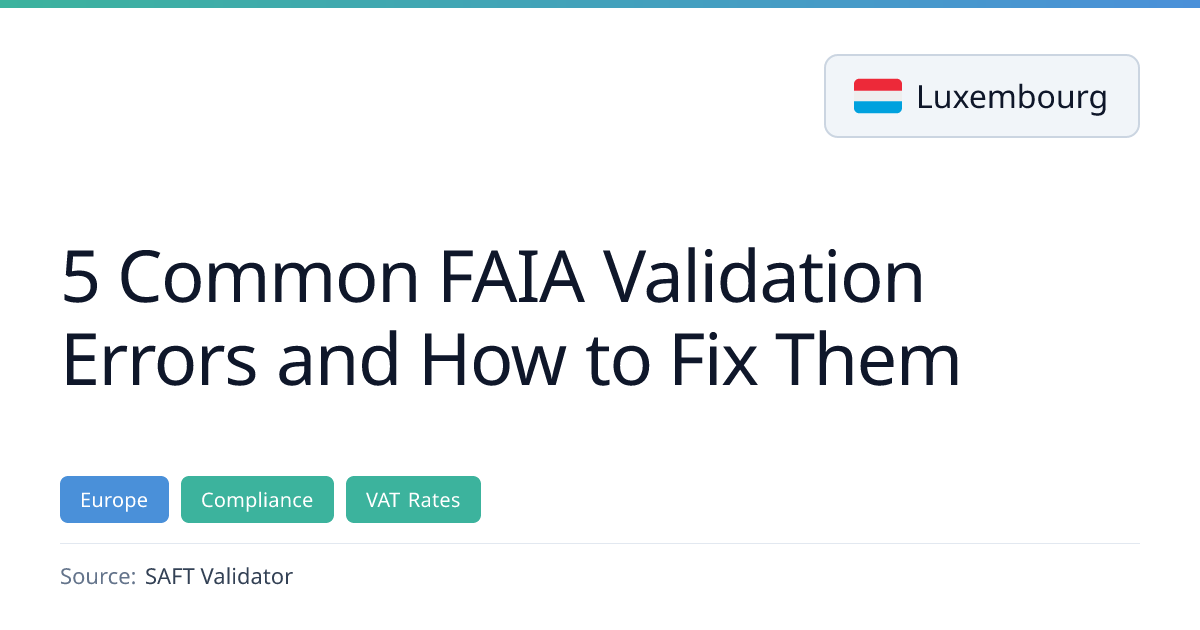 The article outlines five frequent validation failures for Luxembourg’s FAIA files, including missing version identifiers, incorrect VAT codes, absent master data references, improper decimal precision, and wrong date formats. It provides practical steps to correct each issue and a checklist to ensure compliance before submission.