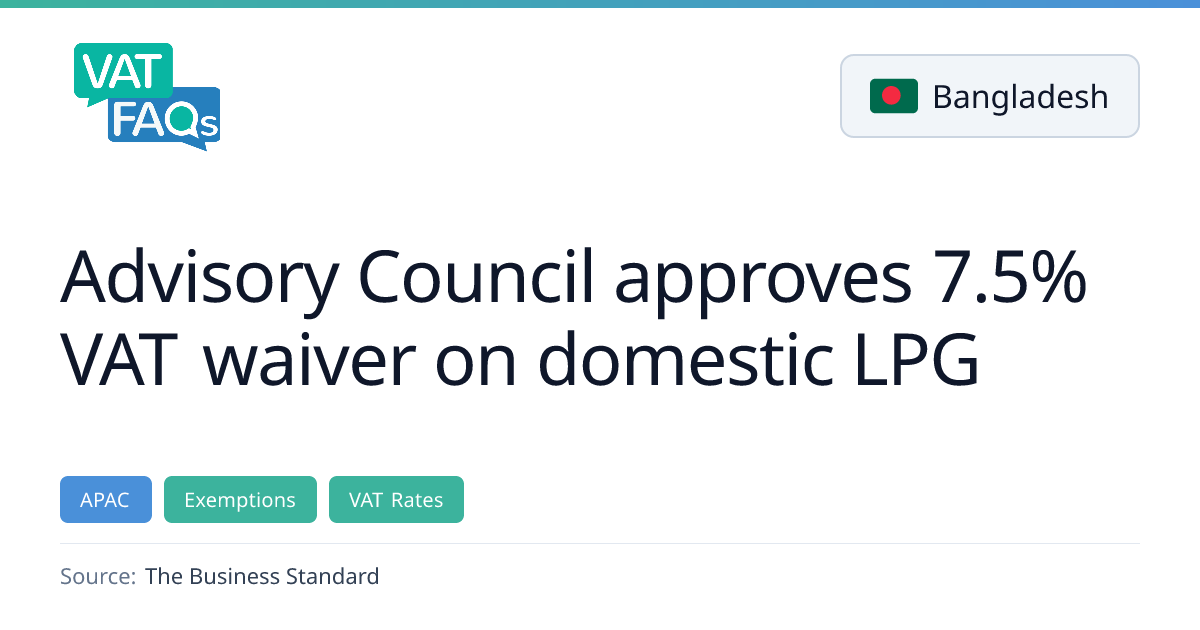 The Advisory Council in Bangladesh has approved a waiver of the 7.5% VAT and 2% advance tax on domestic LPG at local production and trading stages, effective from 5 February 2026. The waiver retains only a 7.5% VAT at the import stage, aiming to reduce the overall tax burden on LPG and potentially lower retail prices.