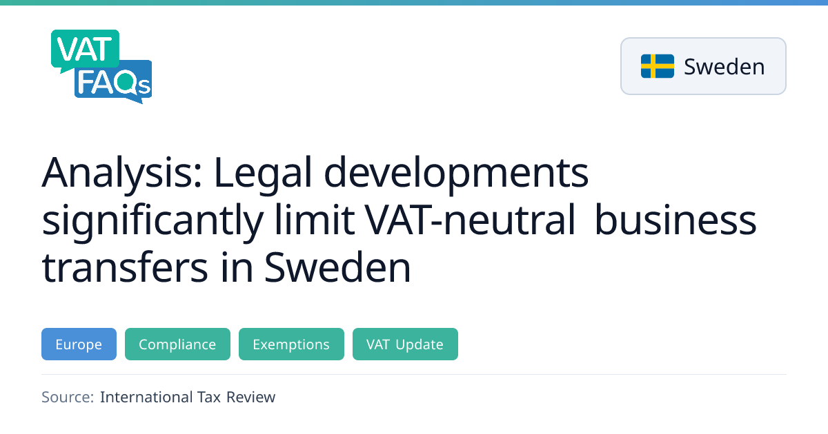 A Swedish Supreme Administrative Court ruling and updated Tax Agency guidance now restrict the scope of the transfer of a going concern (TOGC) exemption. The TOGC applies only when VAT would be chargeable on the asset transfer and the recipient can deduct input VAT, meaning many previously VAT‑neutral restructurings will incur VAT costs. Companies must reassess each asset’s VAT status when planning mergers or internal reorganisations.