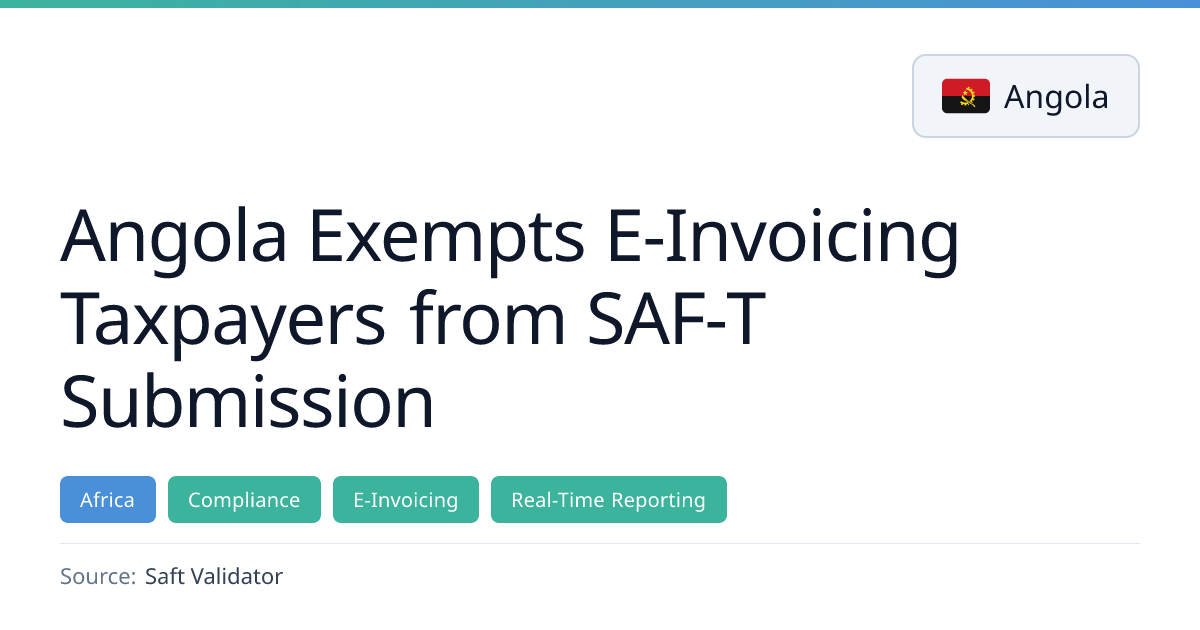 On 20 March 2026 Angola’s AGT exempted taxpayers who issue electronic invoices from the obligation to submit SAF‑T files, simplifying compliance for those already on the e‑invoicing system. The exemption covers large taxpayers, government suppliers and, from 1 October 2026, all remaining VAT‑regime taxpayers, while accounting and inventory SAF‑T obligations remain unchanged.