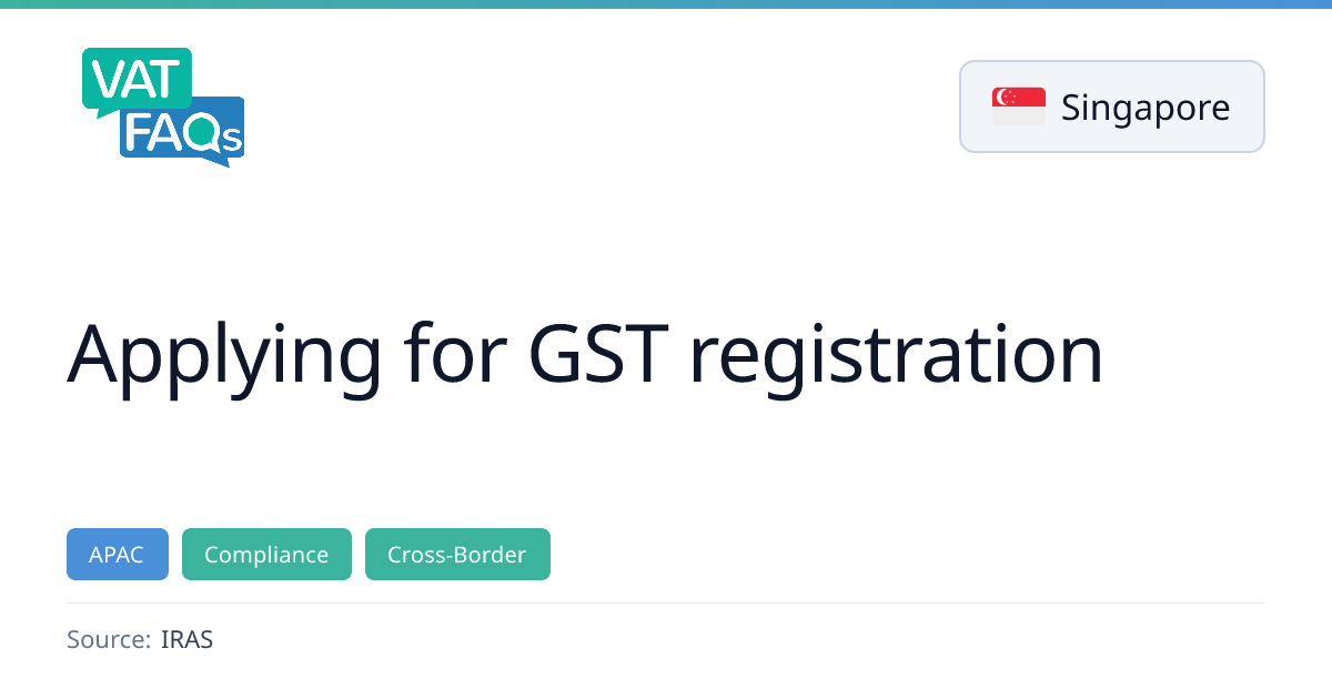 This IRAS guidance outlines the steps for GST registration in Singapore, including e‑learning requirements, GIRO processing, effective dates, and special provisions for overseas entities. It details processing timelines, backdating rules for compulsory registration, and agent appointment obligations for foreign suppliers.