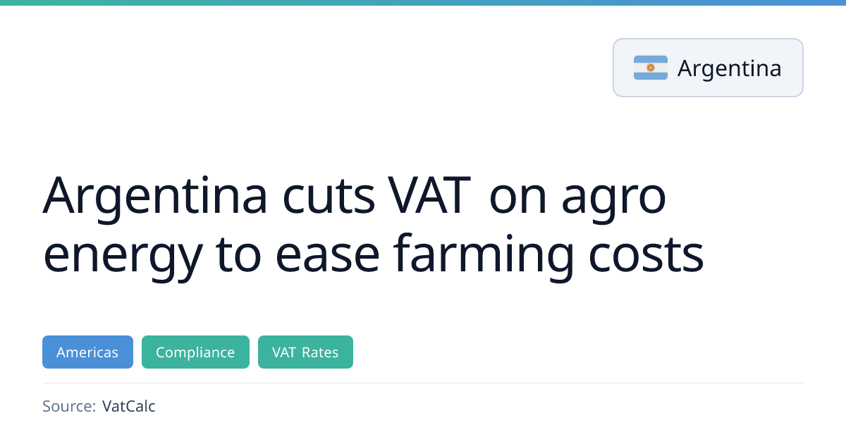 Argentina has reduced the VAT on electricity used in agro‑industrial irrigation systems to 10.5% effective 1 April 2026, cutting the standard 21% rate in half. The measure, part of the Labour Modernisation Law, targets energy consumption linked to irrigation to lower input costs for farmers and support export competitiveness.