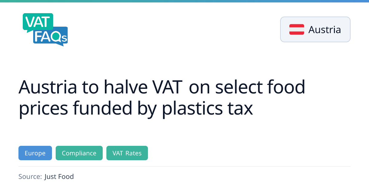 Austria will reduce the VAT on certain food items from 10% to 5% mid‑2026, a measure financed by a new tax on non‑recyclable plastics. The specific foodstuffs eligible for the discount are yet to be defined, and the competition authority will enforce the reduction and ensure retailers pass the benefit to consumers.