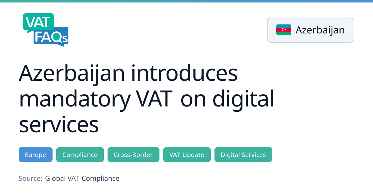 Azerbaijan’s Parliament has approved a new VAT regime for non‑resident digital service providers, requiring local registration, charging, collecting and remitting VAT from 1 January 2026. The change replaces the previous withholding‑tax or optional‑registration system, introduces a USD 10 000 annual sales threshold and ends the B2B reverse charge that had been in place since 2023. The current VAT rate on digital services remains 18%.
