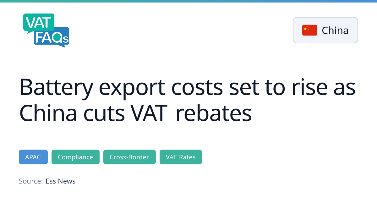 China's Ministry of Finance announced a phased rollback of VAT export rebates for battery products, cutting the rebate from 9% to 6% from April 2026 to December 2026 and eliminating it entirely from January 2027. Photovoltaic product rebates will also be scrapped from April 2026. The move is expected to squeeze margins for exporters unless they can pass costs to overseas buyers, with industry experts forecasting gradual price increases of 2–3% for power batteries and 2–4% for energy storage batteries.