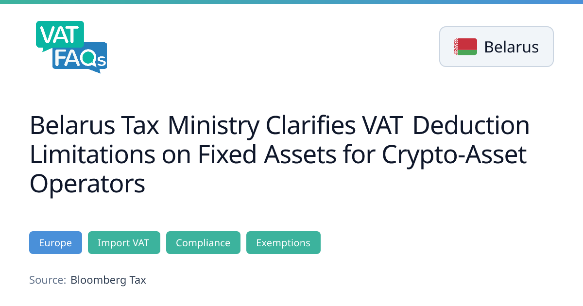 The Belarusian Ministry of Taxes and Duties clarified on 6 February 2026 that fixed assets used by crypto-asset operators are treated as goods for VAT purposes, and that VAT paid on their importation cannot be deducted. The guidance also specifies that fixed assets directly used in token-related activities are subject to non-deductible VAT. This clarification applies to all crypto-asset operators operating within Belarus.