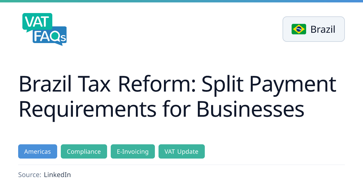 Brazil will roll out an intelligent split payment system for VAT starting 1 January 2026 to curb fraud. Pilot testing begins on 6 April 2026, with the production version following on 4 April. The mechanism requires payment service providers to verify supplier VAT credits before transferring funds, and buyers can only claim credits after the supplier has paid the tax.