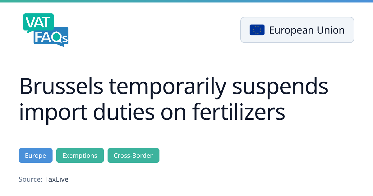 The EU has granted importers of ammonia and urea a temporary exemption from import duties and CO2 tax, effective 1 January 2026, to keep fertilizers affordable for farmers amid the Mercosur trade negotiations.