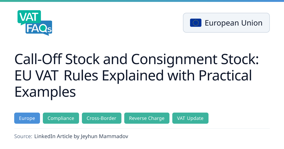 The article explains the EU VAT Directive’s call‑off stock simplification, which exempts the transfer of goods between Member States from VAT when a single, predetermined customer is known. It contrasts this with consignment stock, which triggers a deemed intra‑Community supply and requires VAT registration in the destination country. Practical compliance requirements such as maintaining stock registers, submitting EC Sales List reports, and potential Intrastat reporting are also outlined.