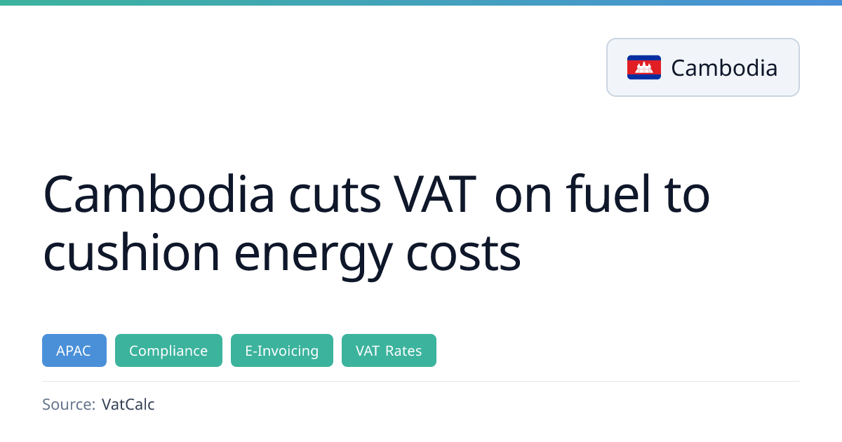 From 20 March 2026, Cambodia will reduce the VAT rate on gasoline and diesel from 10% to 4%, with the government absorbing the remaining 6% to subsidise fuel consumption. The temporary measure applies to both B2B and B2C sales and requires updates to invoicing and e‑filing systems. The change is part of a broader effort to manage energy‑driven inflation without altering the overall VAT framework.