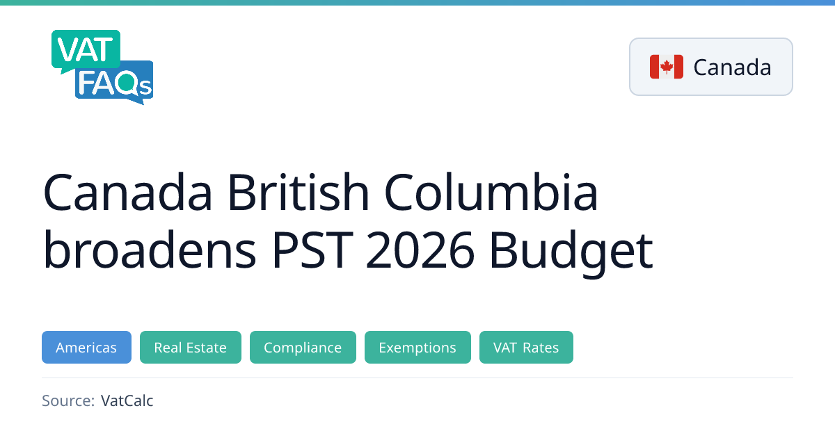 British Columbia will broaden its Provincial Sales Tax (PST) to include a range of professional services from 1 October 2026, maintaining a 7% rate that, combined with the federal 5% GST, brings the total tax on most supplies to 12%. For architectural, engineering and geoscience services, PST will apply to only 30% of the purchase price. Service providers in the new scope must register for PST and prepare to charge, collect and remit the tax, with further administrative guidance to follow.