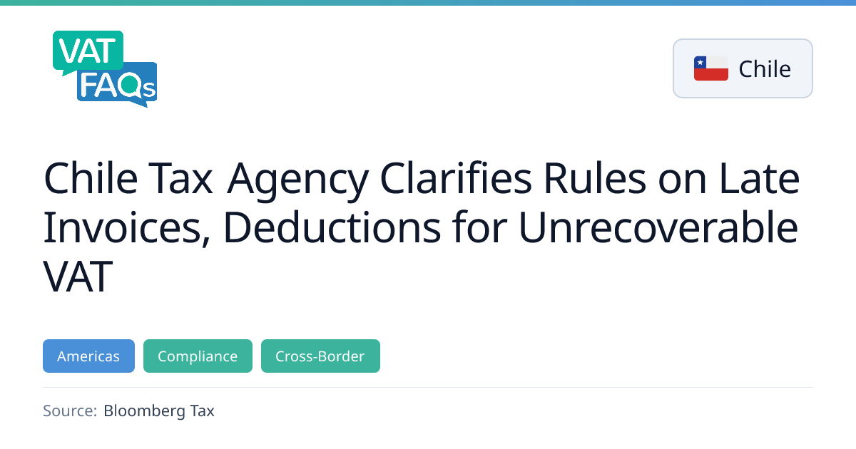 Chile’s Internal Revenue Service (SII) will shift VAT collection from non‑resident sellers to Chilean financial institutions starting 1 June 2026, imposing a 19 % withholding rate on eligible transactions. The first list of non‑compliant digital VAT taxpayers will be published 15 June 2026, with financial institutions required to file monthly Form 29 and a semiannual report by the last business day of February 2027.