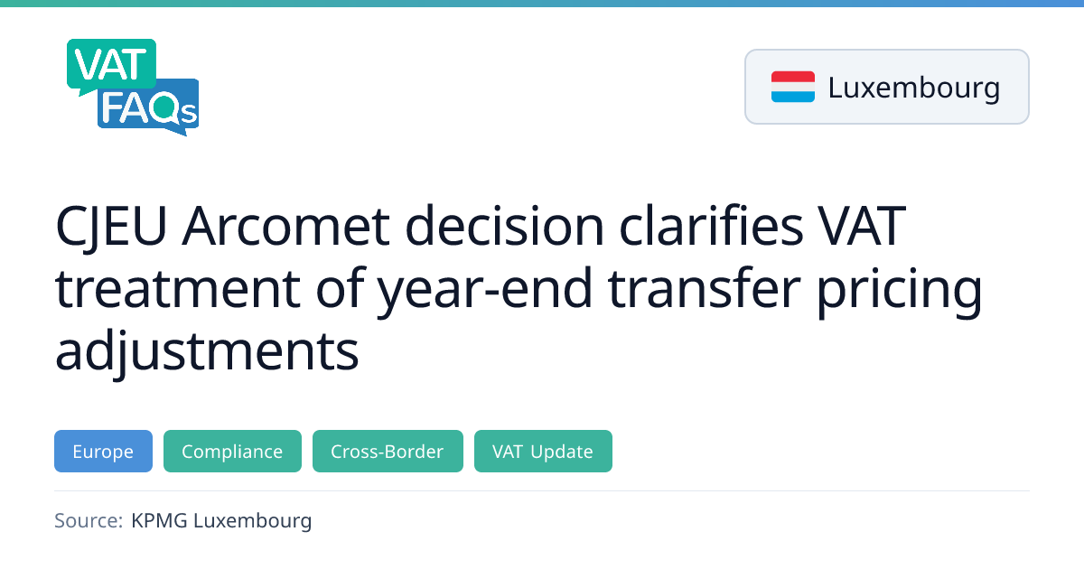 The Court of Justice of the EU ruled that year‑end transfer‑pricing adjustments that increase profits to align with the arm’s‑length principle may be considered VAT‑eligible if the services and payment terms were agreed in advance. Documentation for input‑VAT deduction remains necessary and proportionate, but taxpayers need not prove economic necessity of the services. The ruling clarifies that VAT applies only where a clearly identifiable service is provided for remuneration, providing legal certainty across Member States.