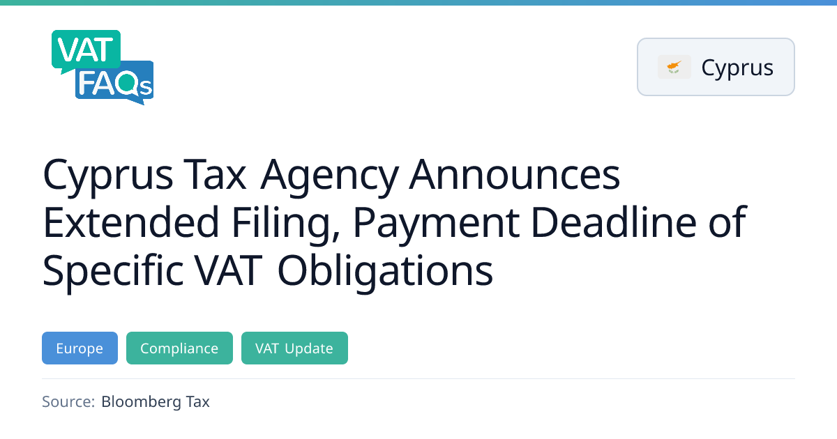 Cyprus Tax Agency extended the filing and payment deadline for certain VAT obligations to Jan. 20, 2026. The extension covers VAT returns for the period ended Nov. 30, 2025, VIES summary tables for December 2025, and flat‑rate declarations for the special urban taxi regime. Late filing may incur a 10% additional VAT and a €100 penalty.