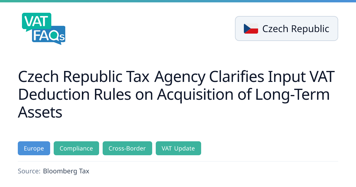 The Czech Tax Agency clarified input VAT deduction rules for acquisitions of long‑term assets effective 1 January 2025. The guidance outlines procedures for partial deductions, incorporates the EU cross‑border regime for small enterprises, and sets a deadline for claiming deductions by the end of the second calendar year after the relevant year.