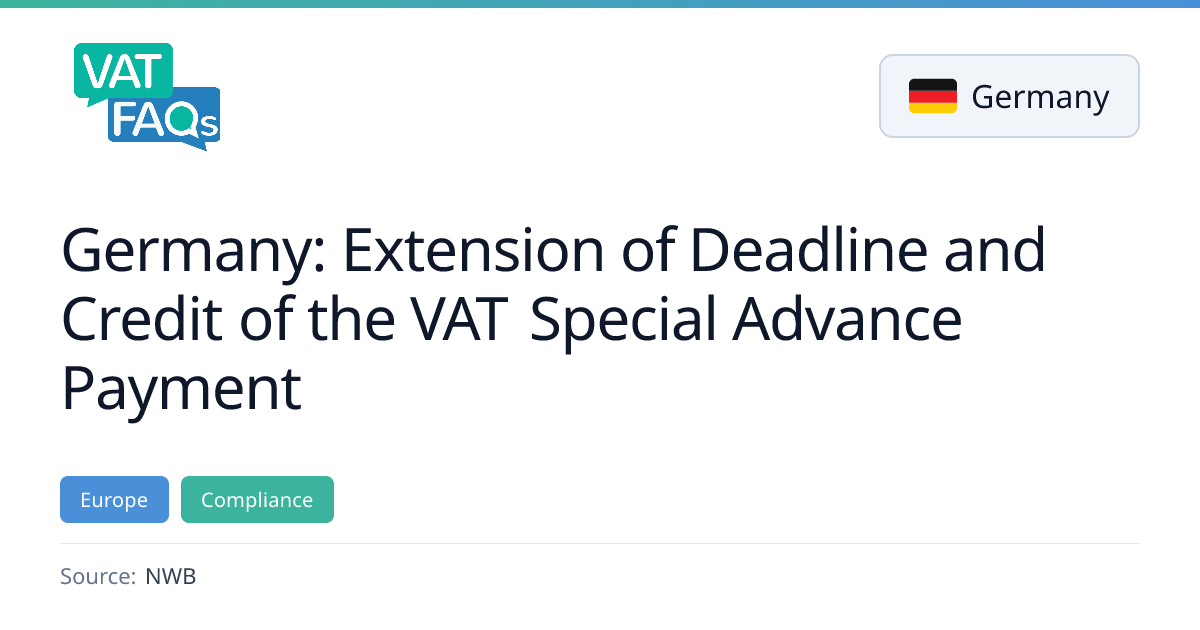 This guidance explains that German businesses can apply to extend the deadline for filing VAT returns by one month. If the extension is used, a special advance payment equal to one‑eleventh of the previous year’s advance payments must be paid, and it is credited in the December advance payment calculation. The special payment can be corrected upon application if expected VAT changes due to a rate change.