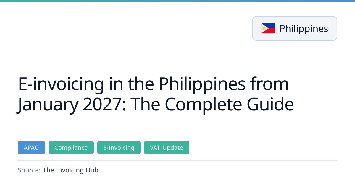 The Philippines will require structured e‑invoicing for large taxpayers and e‑commerce businesses from 1 January 2027, with the first phase of the mandate taking effect on 31 December 2026. The requirement is based on the TRAIN Law and BIR Revenue Regulation 011‑2025, but specific structured formats have yet to be defined. A second phase is expected later in 2027 to extend the mandate to all businesses and mandate transmission via a central platform.