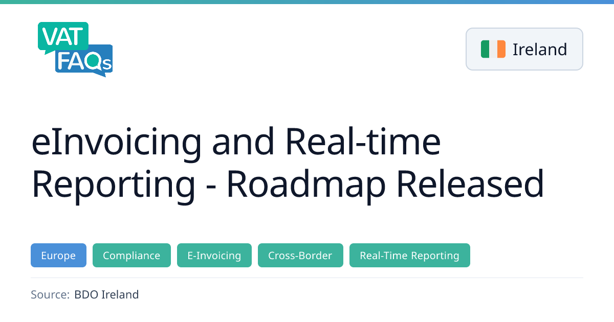 On 8 October 2025, Irish Revenue released a roadmap for implementing the EU's ViDA e‑invoicing and real‑time reporting requirements. The plan phases the rollout, with large corporates required to adopt the system in November 2028, all VAT‑registered businesses in intra‑EU B2B trade by November 2029, and full compliance for all cross‑border EU B2B transactions by 1 July 2030. The definition of a large corporate was clarified on 10 February 2026.