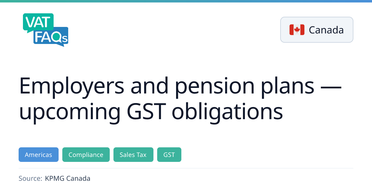 KPMG Canada outlines new GST/HST and QST obligations for employers and pension plans. Employers offering registered pension plans must remit by January 31, 2026, while pension entities and master pension entities must file annual returns by June 30, 2026. The guidance also advises reviewing SLFI status and claiming eligible rebates.