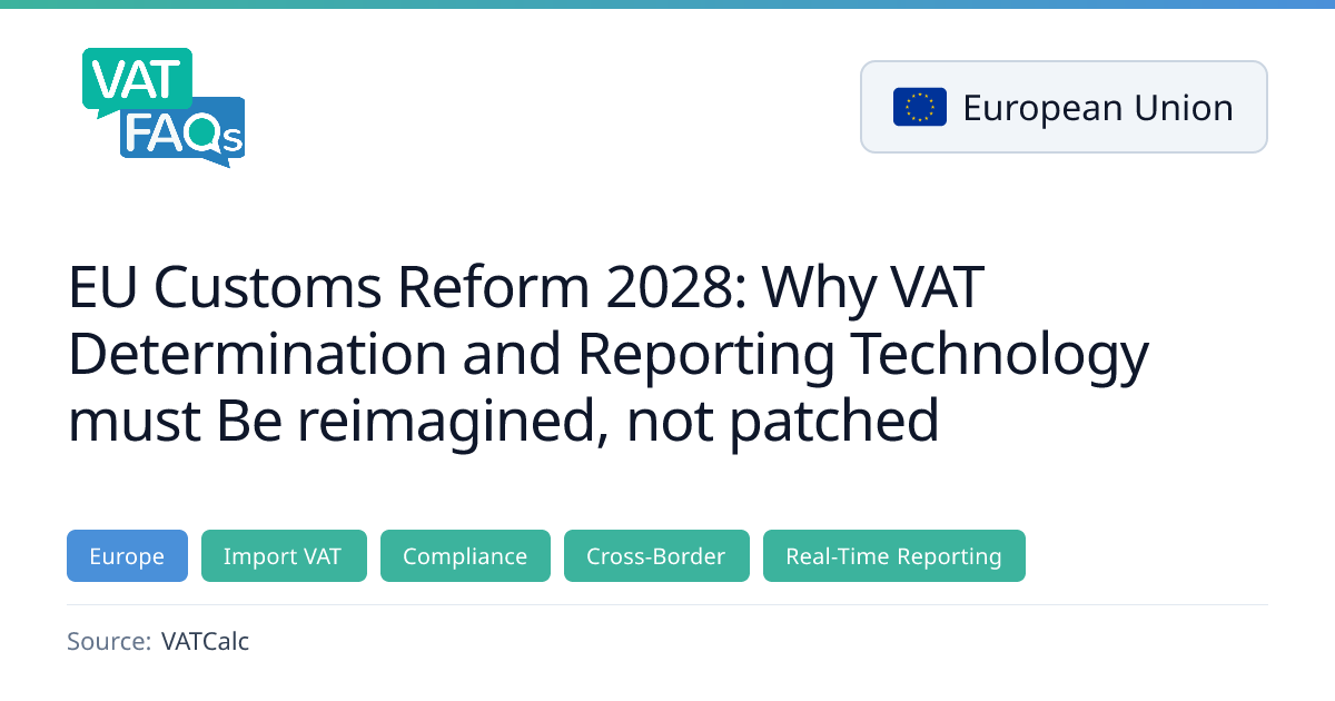 VATCalc explains how the EU’s 2028 Customs Reform will eliminate the €150 low‑value threshold, expand platform liability, and require real‑time, transaction‑level VAT determination and reporting. The article argues that legacy VAT systems are ill‑suited and that a single, legislative‑coded engine is essential to meet the new harmonised import VAT model across all 27 Member States. It highlights the need for rapid, integrated compliance to avoid penalties and operational risk.