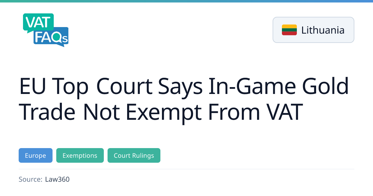 The EU's top court ruled that proceeds from trading virtual gold in online video games are subject to VAT, overturning any exemption. The decision supports Lithuania's efforts to collect tax on digital goods and has implications for VAT treatment of virtual goods across the EU.