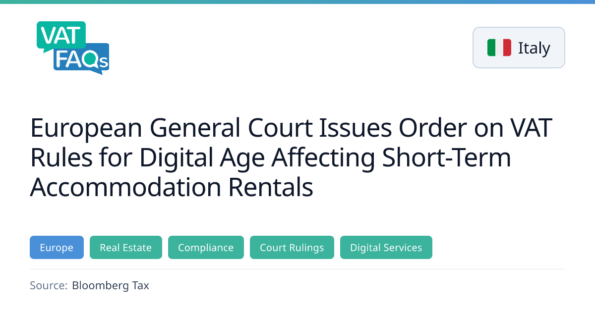The European General Court dismissed an Italian association’s challenge to EU VAT directives that impose a deemed‑supplier model on digital platforms for short‑term accommodation rentals. The court held the association lacked direct and individual concern, as the rules target platform operators, not property owners. The decision confirms the applicability of Directive (EU) 2025/516 and Regulation (EU) 2025/518.