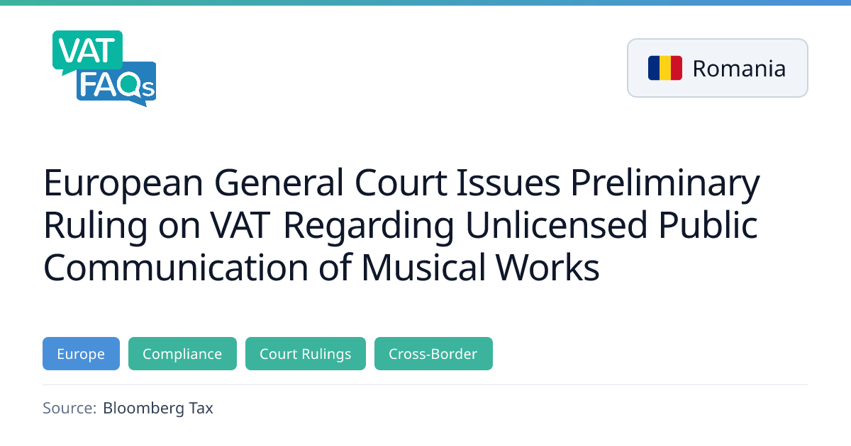On 11 February 2026 the European General Court issued a preliminary ruling in Case T‑643/24 concerning the VAT treatment of unlicensed public communication of musical works by a Romanian guest house. The court held that under Directive 2006/112/EC the act constitutes a supply of services for consideration, thereby subjecting it to VAT. The decision clarifies the application of VAT to the entire tripled amount charged for the broadcast.