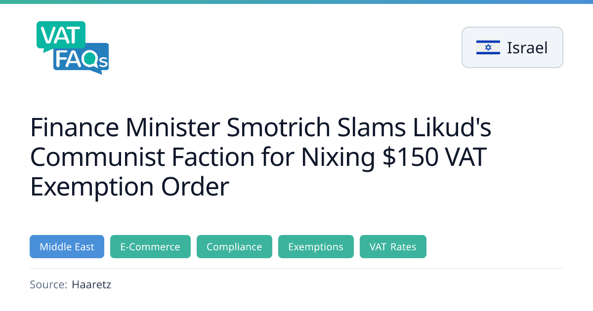 Finance Minister Bezalel Smotrich sought to double the VAT exemption for personal online imports to $150, but lawmakers rejected the proposal. He subsequently signed an order raising the exemption to $130, a move that has been appealed to Israel's top court. The change affects the VAT treatment of online purchases by Israeli consumers.