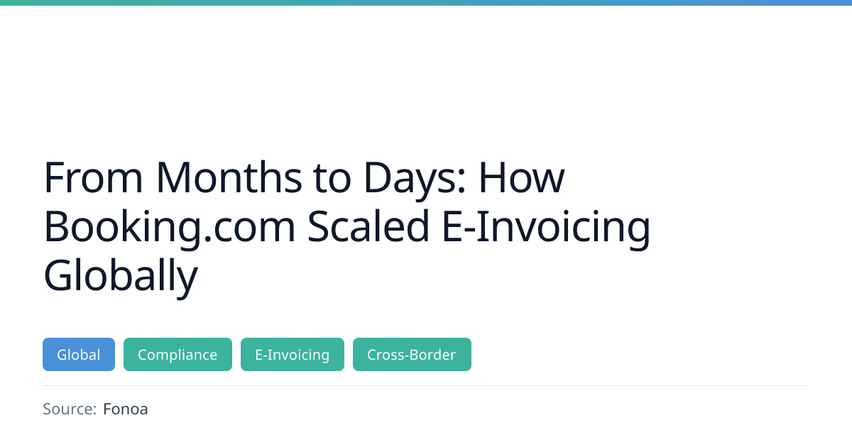 This webinar discusses how Booking.com scaled its e‑invoicing compliance across multiple European markets by centralizing tax data and partnering with Fonoa. The presentation highlights the shift from a country‑by‑country approach to a unified strategy, the cross‑functional collaboration required, and practical guidance on vendor selection and implementation planning.