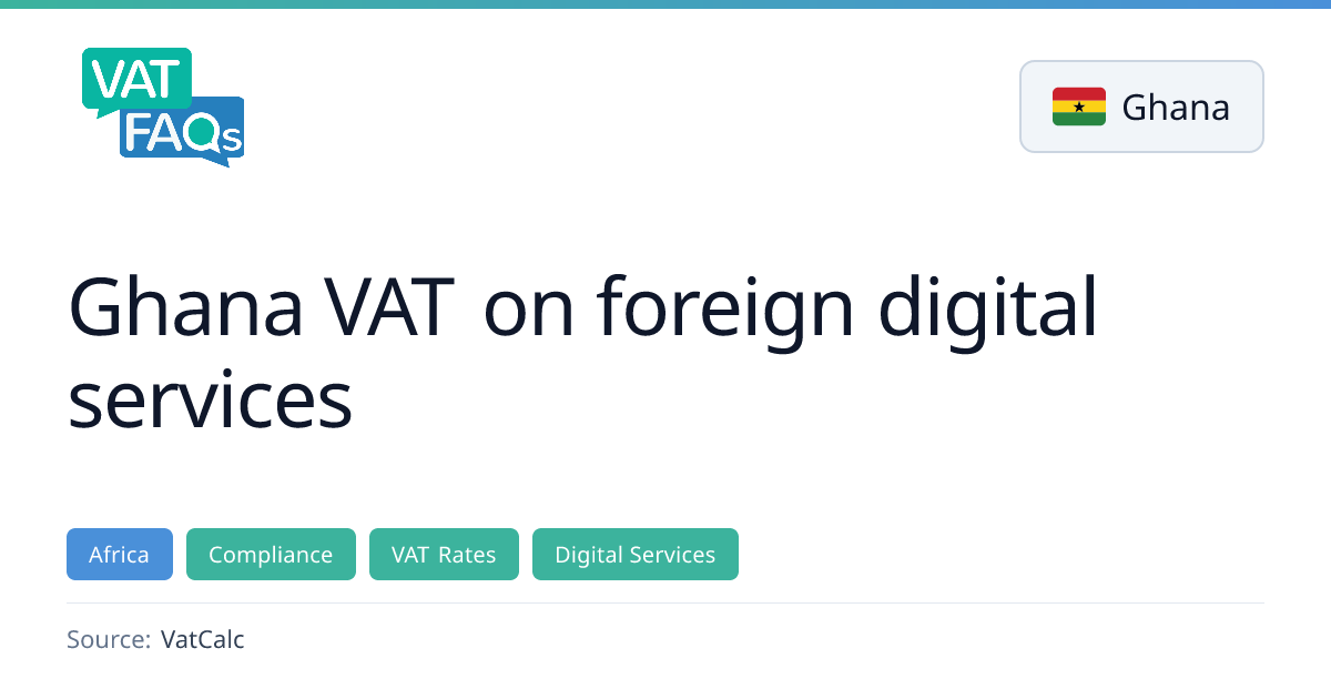 Ghana introduced a 12.5% VAT on non‑resident digital service providers to local consumers effective 1 April 2022. The law sets a GHS 200,000 annual turnover threshold for registration and requires monthly returns filed by the 21st of the following month. Non‑resident suppliers must appoint a resident representative or VAT agent to comply.