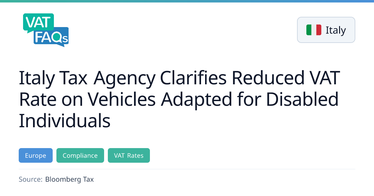 The Italian Revenue Agency issued Letter No. 35/2026 on 11 February 2026, confirming that a 4 % reduced VAT rate applies to vehicles adapted for individuals with motor disabilities who hold a BS‑category special driving licence with adaptation codes, even without a disability certificate under Law No. 104/1992. The guidance clarifies eligibility requirements and documentation needed for the reduced rate.