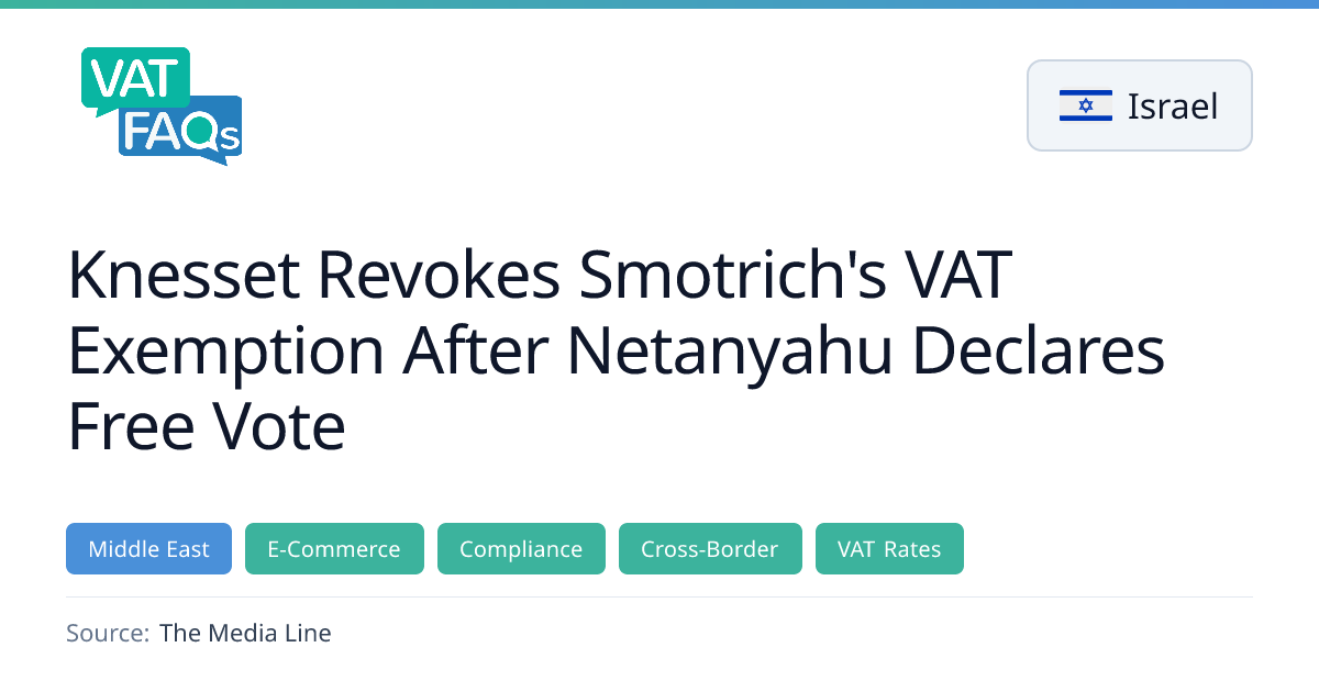 The Israeli Knesset voted on 24 February 2026 to revoke a ministerial order that would have raised the VAT exemption threshold for online purchases from $75 to $150. The order, which had been in effect since December 24, was defeated 25–59 after Prime Minister Netanyahu allowed a free vote for coalition lawmakers. The revocation removes the exemption for imported packages valued up to $150, restoring the previous $75 threshold.