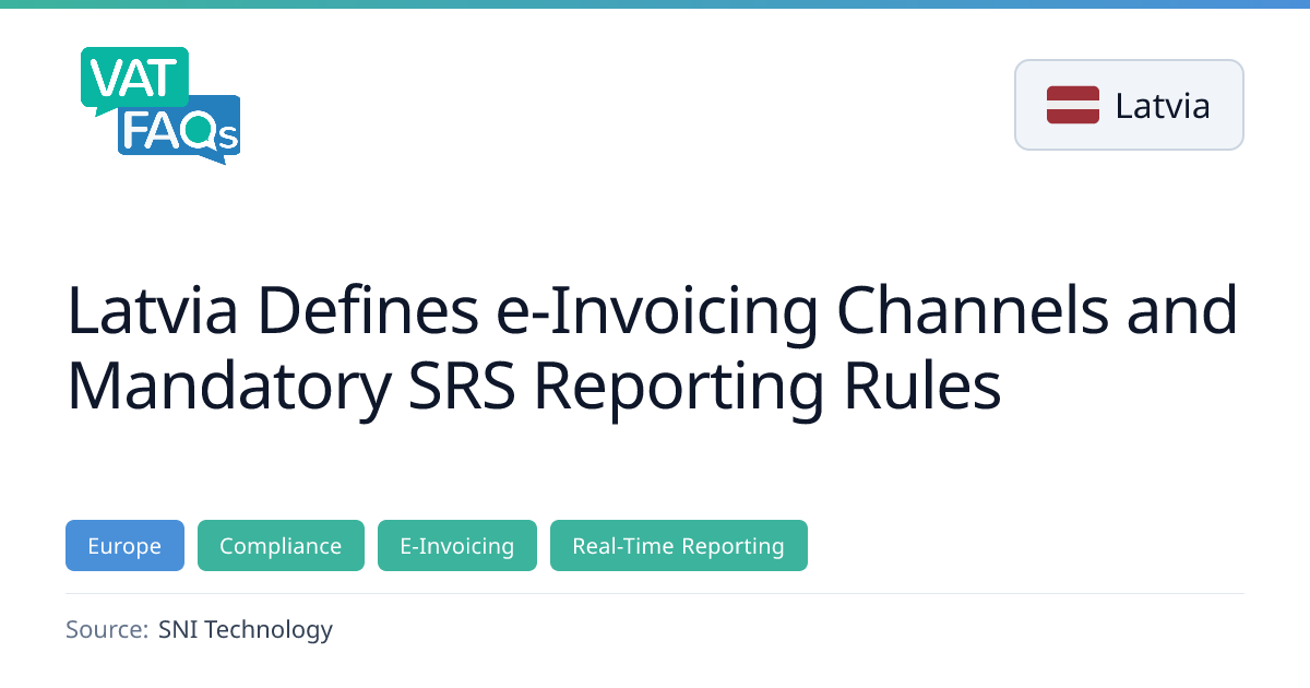 Latvia’s Cabinet Regulation, effective 1 January 2026, mandates structured electronic invoicing and reporting to the State Revenue Service (SRS) for all B2G, G2B, and G2G transactions, with B2B reporting becoming mandatory from 1 January 2028. The regulation specifies four delivery channels—e‑adrese, certified service providers, EDI, and email—each linked to a distinct SRS reporting method and requires XML invoices in UBL 2.1 or Peppol BIS Billing 3.0. Invoices must be reported within five working days of issuance, with contingency rules for technical disruptions.