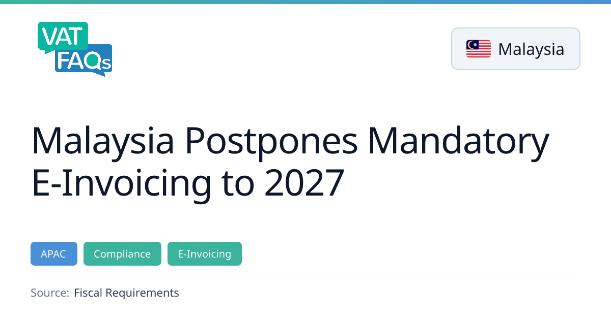 Malaysia’s IRBM has raised the e‑invoice exemption threshold to RM 1 million (~€200 k) effective 7 Dec 2025, exempting companies below that turnover. The interim relaxation period for small enterprises has been extended until 31 Dec 2026, delaying mandatory e‑invoicing for those with turnover under RM 1 million. The 5th wave of mandatory e‑invoicing scheduled for 1 July 2026 has been abolished for existing companies.