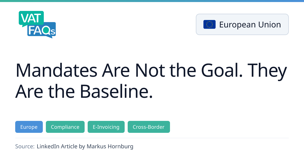 The article argues that compliance with country mandates should be seen as a baseline, not the ultimate goal. It emphasizes that true invoicing success lies in data governance and ensuring invoices are accurate, fraud‑free, and defensible in accounting, rather than merely passing XML validation. The author highlights mandates in Poland, France, Belgium, Germany, and Saudi Arabia, and calls for a holistic approach to tax determination and data integrity.