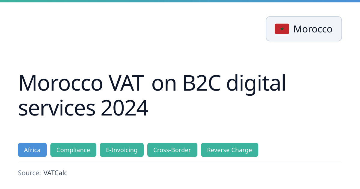 Morocco has introduced a new VAT regime for non‑resident digital service providers, requiring quarterly registration, reporting and payment via a dedicated electronic platform effective 11 June 2026. The 20 % VAT rate applies to B2C digital services, with detailed transaction‑level reporting mandated within 30 days of each quarter. B2B digital services remain nil‑rated for foreign suppliers, with reverse charge applied by Moroccan VAT‑registered businesses.