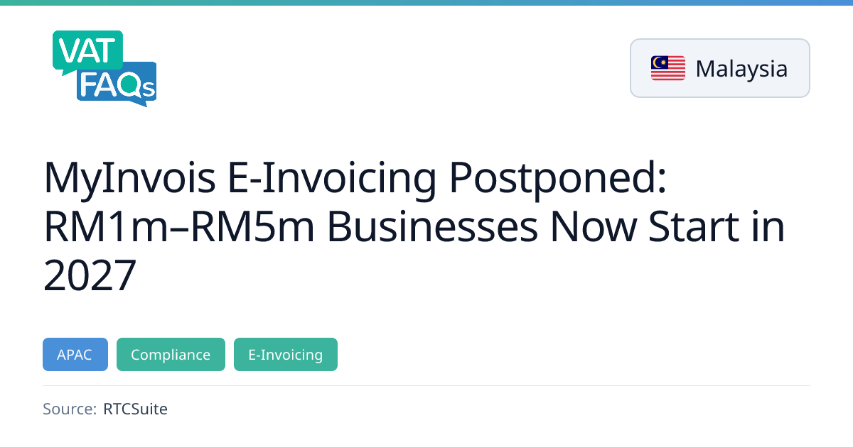 Malaysia’s IRBM has raised the e‑invoice exemption threshold to RM 1 million (~€200 k) effective 7 Dec 2025, exempting companies below that turnover. The interim relaxation period for small enterprises has been extended until 31 Dec 2026, delaying mandatory e‑invoicing for those with turnover under RM 1 million. The 5th wave of mandatory e‑invoicing scheduled for 1 July 2026 has been abolished for existing companies.