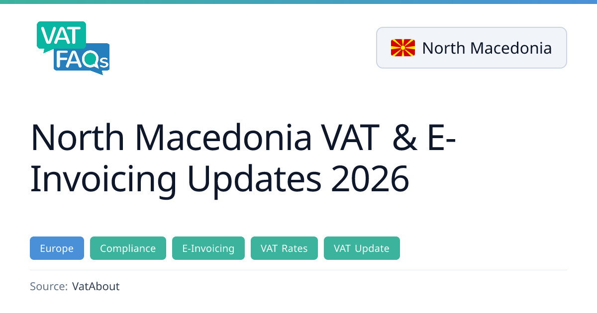 North Macedonia has introduced several VAT and e‑invoicing updates in late 2025 and early 2026. The VAT exemption for small‑value shipments is now limited to non‑commercial items, the 5% preferential rate for residential buildings is extended to 2028, and a pilot e‑invoice system (e‑Faktura) began on 5 January 2026. A new Top‑up Tax Rulebook was also published, aligning with OECD standards.