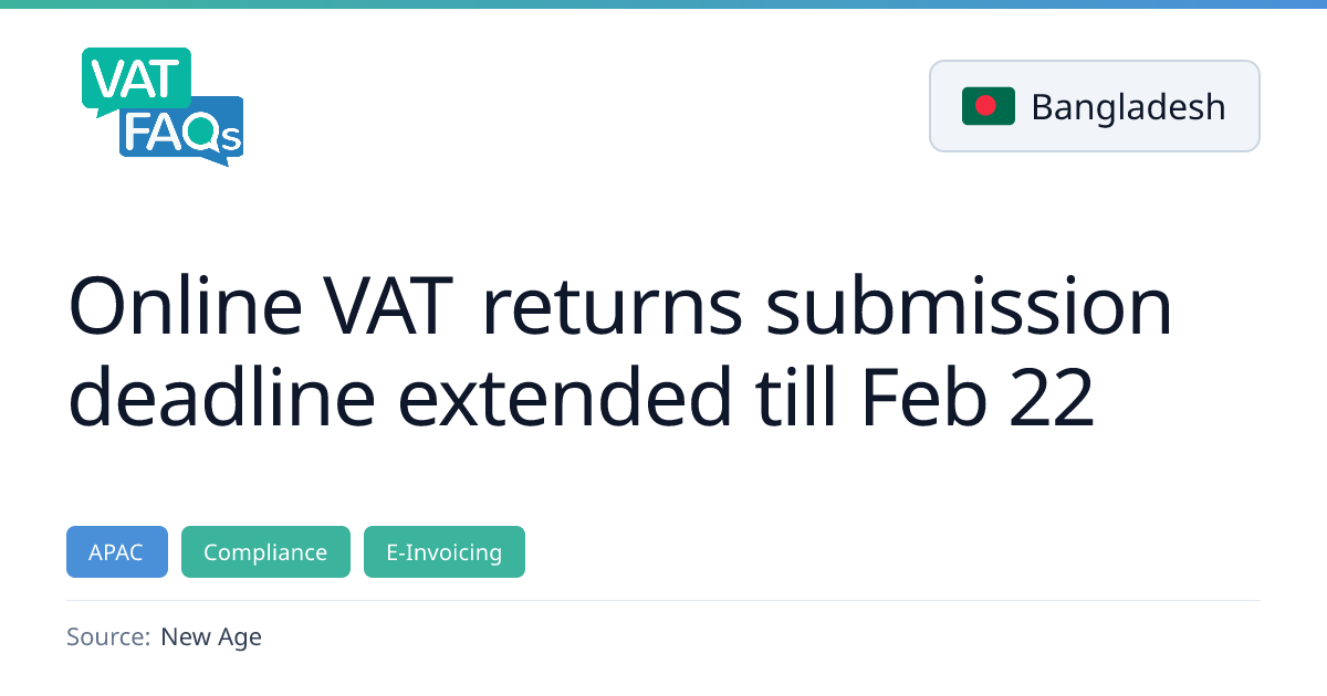 The National Board of Revenue (NBR) in Bangladesh has extended the deadline for filing online VAT returns via its e‑VAT system to 22 February 2026. The extension was granted to accommodate government holidays around Shab‑e‑Barat, a national election, and technical disruptions on 15 February. Taxpayers are urged to submit their January 2026 returns within the new period to avoid penalties.