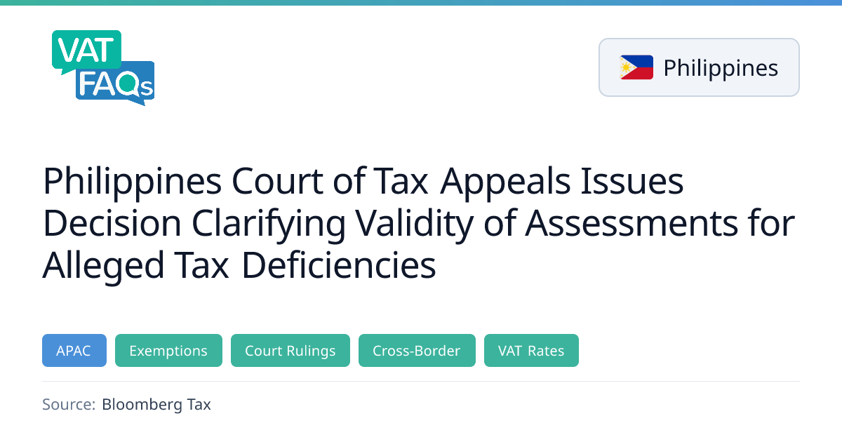 The Philippine Court of Tax Appeals issued a decision on Feb. 10, 2026 (CTA Case No. 10561) clarifying the validity of assessments for alleged tax deficiencies. The case involved a domestic corporation claiming entitlement to a 5 % preferential gross income tax rate and a 12 % VAT exemption, arguing that the Commissioner of Revenue had incorrectly applied a 30 % threshold for income from Philippine sources outside the Subic Special Economic and Freeport Zone. The court examined whether the sales in question were within the zone and the implications for the tax assessments.