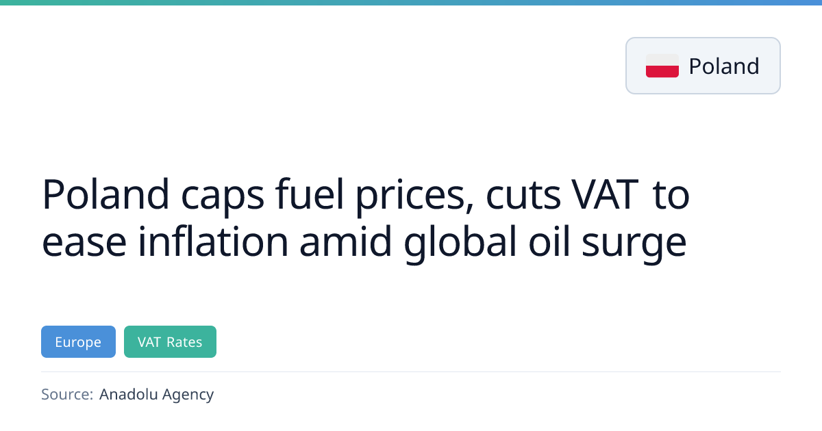 Poland announced a fuel price cap and a sharp VAT cut on fuels to ease inflation amid rising global oil prices. Starting 31 March 2026, 95‑octane petrol will be capped at 6.16 PLN per liter, diesel at 7.60 PLN, and 98 petrol at 6.76 PLN, while the VAT rate on fuels drops from 23% to 8%. Retailers exceeding the cap face fines up to 1 million PLN, and the measures are estimated to cost the government 1.6 billion PLN per month.
