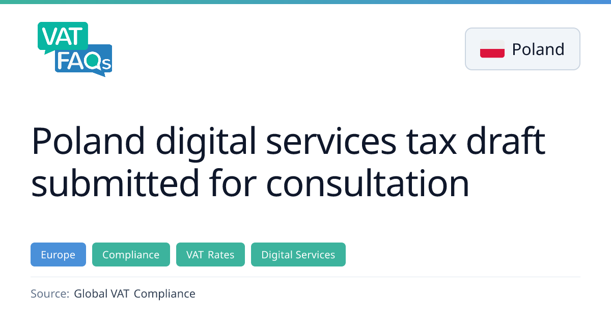 Poland has submitted a draft digital services tax to the legislative programme. The proposal would levy a 3% compensatory tax on digital services in Poland, applying to entities with global revenue over EUR 1 billion and Polish taxable revenue over PLN 25 million. Public consultations are set to start 2 Feb 2026, with no implementation date yet announced.