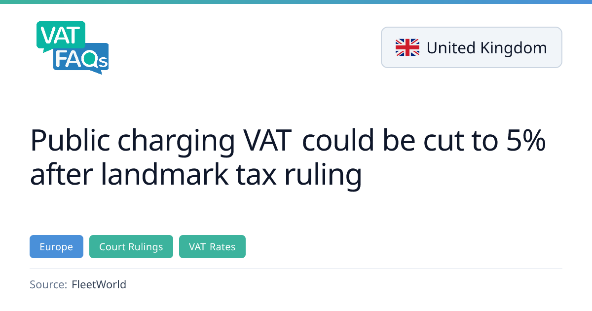 A UK tribunal ruled that community public charging supplies qualify for the 5% reduced VAT rate under the de minimis provision, overturning HMRC's earlier 20% requirement. The ruling applies to supplies below 1,000 kWh per month per customer at each location and is limited to operators meeting the community‑based model. The decision could influence VAT treatment for other public charging operators.