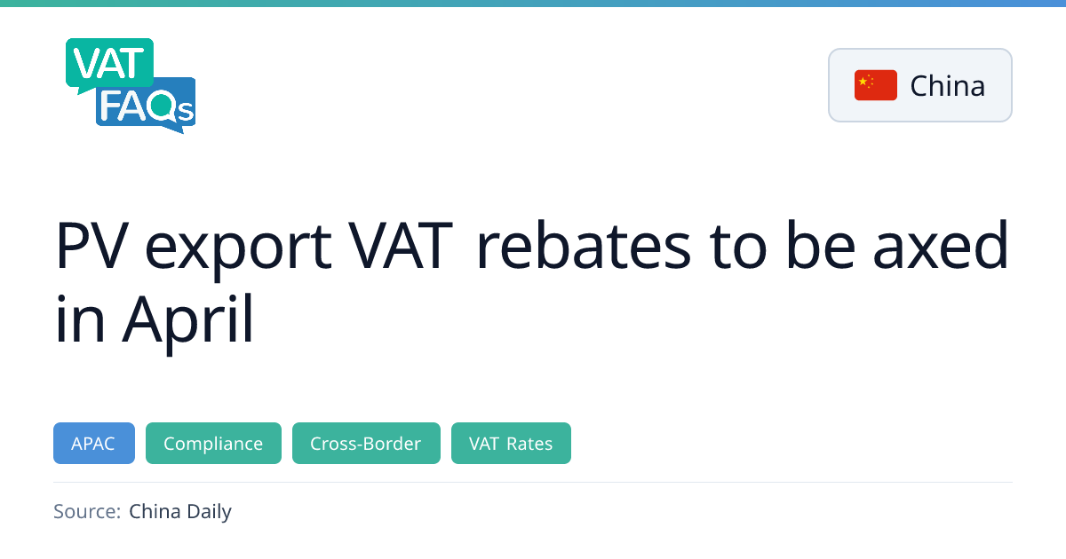 From April 2026, China will scrap value‑added tax rebates on photovoltaic products, ending the export rebate for PV modules.