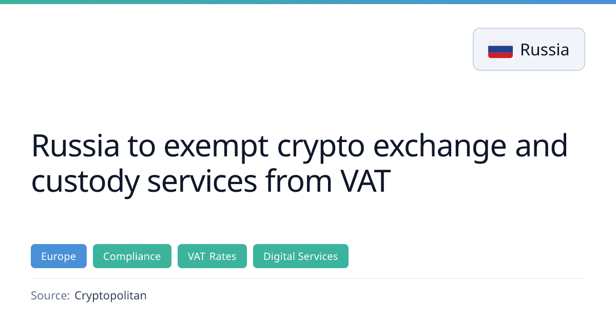 Russia will exempt cryptocurrency exchange and custody services from value‑added tax, covering ancillary services related to issuance and trading of digital currencies. The bill, expected to be adopted by July 1 2026, also sets corporate tax rules for platform profits and allows traders to offset acquisition costs against income, though losses cannot be carried forward.