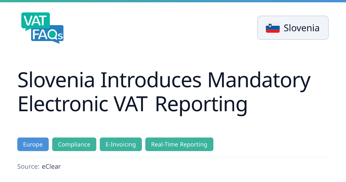 Slovenia launched mandatory electronic VAT reporting (e-poročanje) in July 2025, requiring all VAT-registered businesses to submit records through the e-Davki portal. B2B e-invoicing follows in 2027.