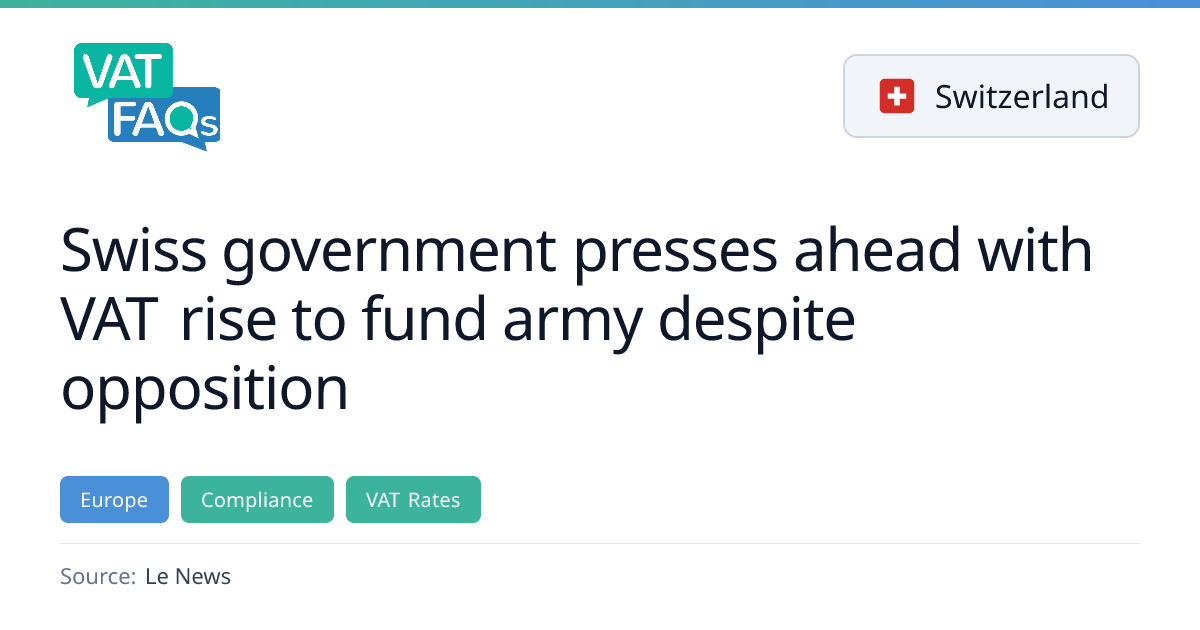Switzerland is considering a 0.8 percentage‑point increase in its standard VAT rate from 8.1% to 8.9% to raise about CHF 31 billion for defence spending over ten years. The proposal, announced by the Federal Council in January 2026, would need parliamentary approval and a 2027 referendum. A separate 0.7 percentage‑point VAT rise to 8.8% for pension reforms was approved in April 2024 and is expected to take effect on 1 January 2028, pending a 2027 referendum.