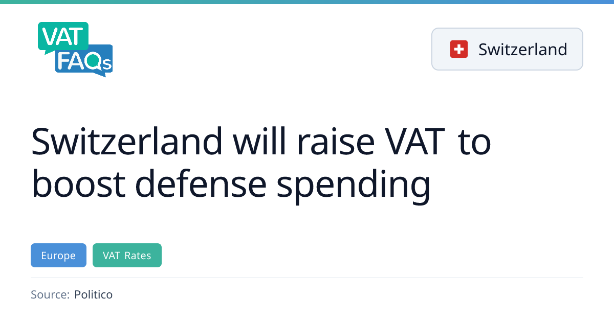 Switzerland is considering a 0.8 percentage‑point increase in its standard VAT rate from 8.1% to 8.9% to raise about CHF 31 billion for defence spending over ten years. The proposal, announced by the Federal Council in January 2026, would need parliamentary approval and a 2027 referendum. A separate 0.7 percentage‑point VAT rise to 8.8% for pension reforms was approved in April 2024 and is expected to take effect on 1 January 2028, pending a 2027 referendum.