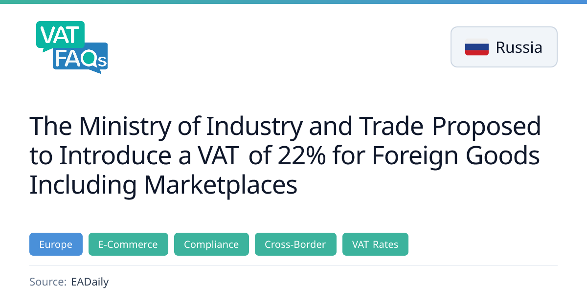 Russia’s Ministry of Industry and Trade has proposed a flat 22% VAT on all foreign goods, including purchases via online marketplaces, effective 1 January 2027. The proposal contrasts with a Ministry of Finance draft that would raise the rate gradually from 5% in 2027 to 20% in 2030. The announcement was made by Minister Anton Alikhanov at the Duma Committee on Industrial Policy on 11 February 2026.