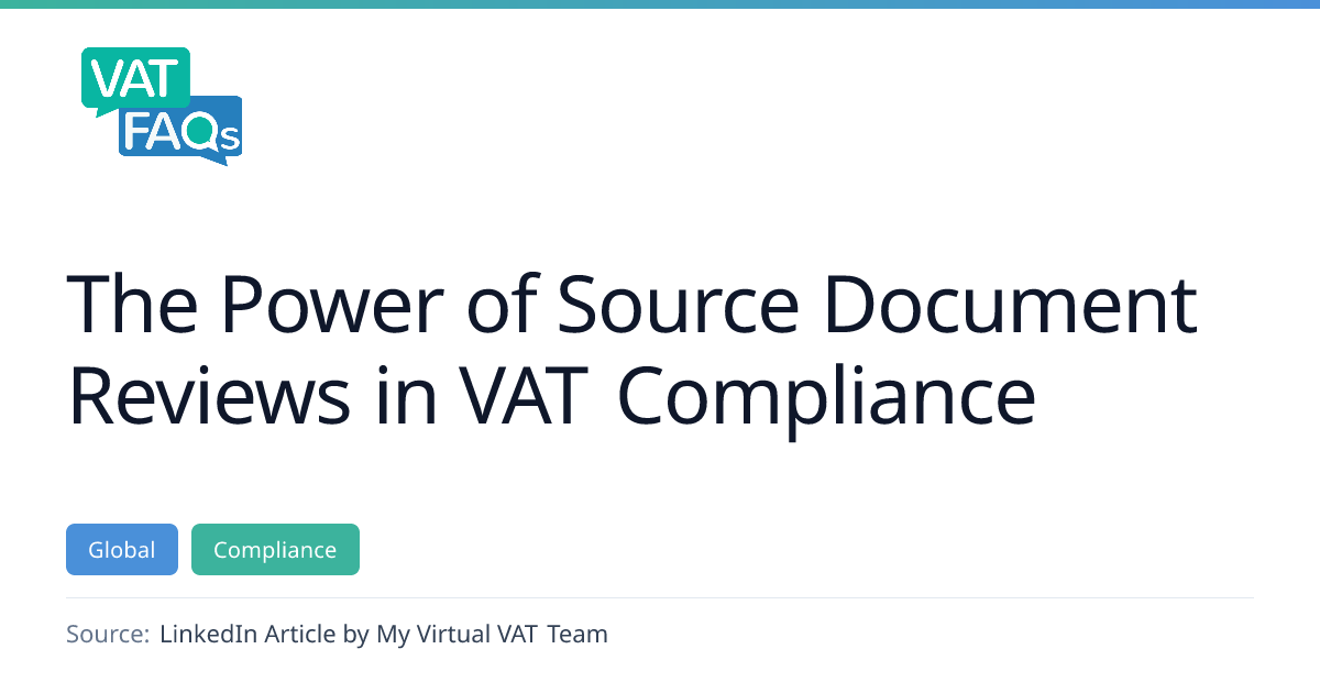 This article discusses the importance of reviewing source documents for VAT compliance, highlighting common issues uncovered such as incorrect VAT treatment, missing invoice details, and data quality problems. It recommends a sampling approach of 10‑15 invoices per period and emphasizes the need to document findings and act on insights to improve processes.